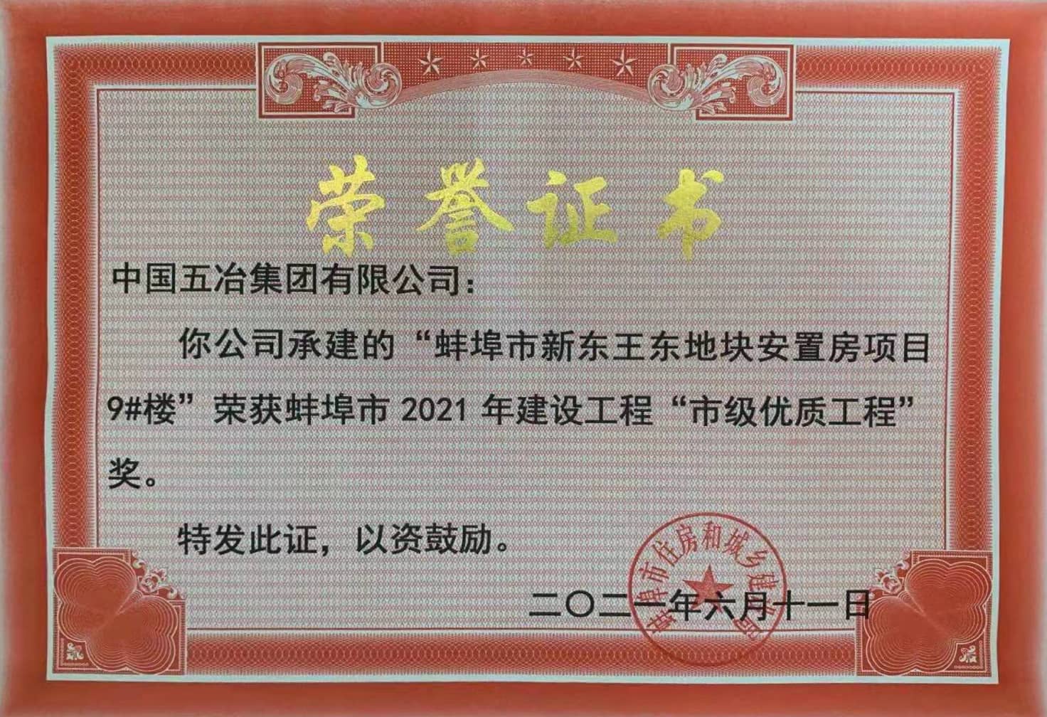 蚌埠市新東王東地塊安置房項(xiàng)目9#樓榮獲蚌埠市2021年建設(shè)工程“市級(jí)優(yōu)質(zhì)工程”獎(jiǎng)
