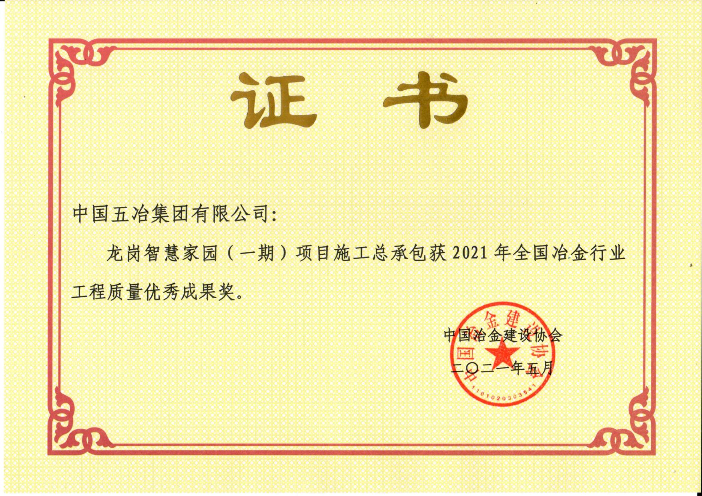 龍崗智慧家園(一期)項目施工總承包獲2021年全國冶金行業工程質量優秀成果獎
