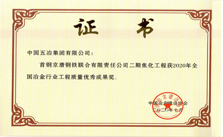 首鋼京唐鋼鐵聯合有限責任公司二期焦化工程——2020年全國冶金行業工程質量優秀成果獎