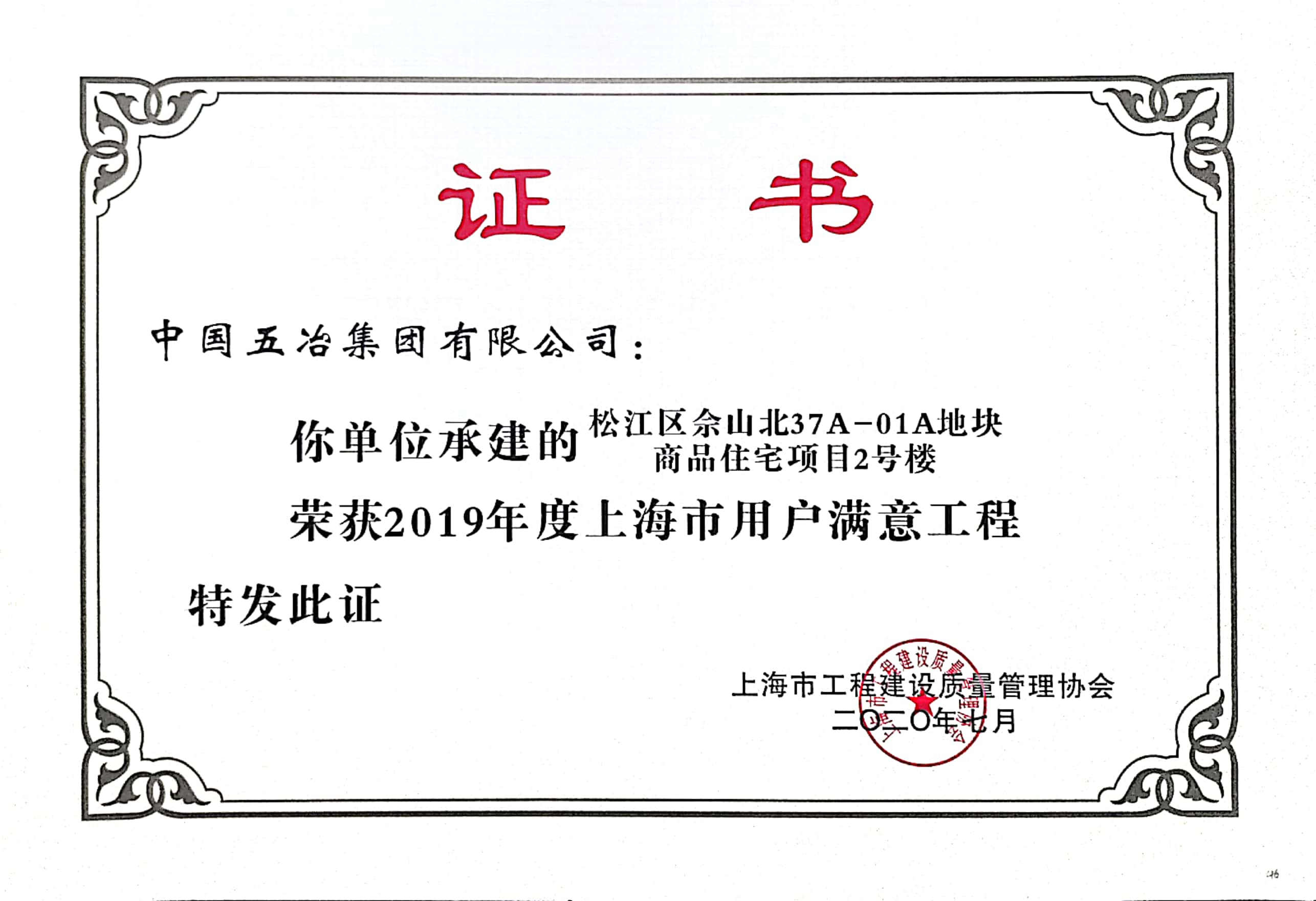 松江區佘山北37A-01A地塊商品住宅項目2號樓榮獲2019年度上海市用戶滿意工程