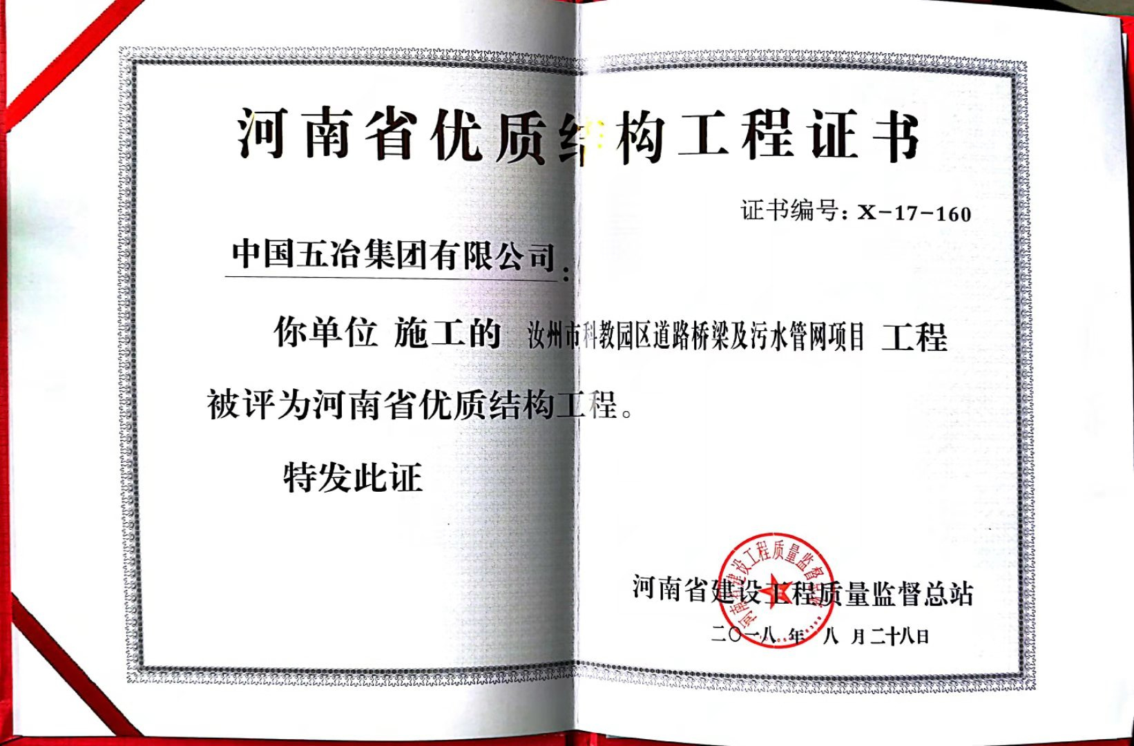 汝州科教園道路橋梁及污水管網(wǎng)工程榮獲2017年下半年度河南省優(yōu)質(zhì)結(jié)構(gòu)工程獎