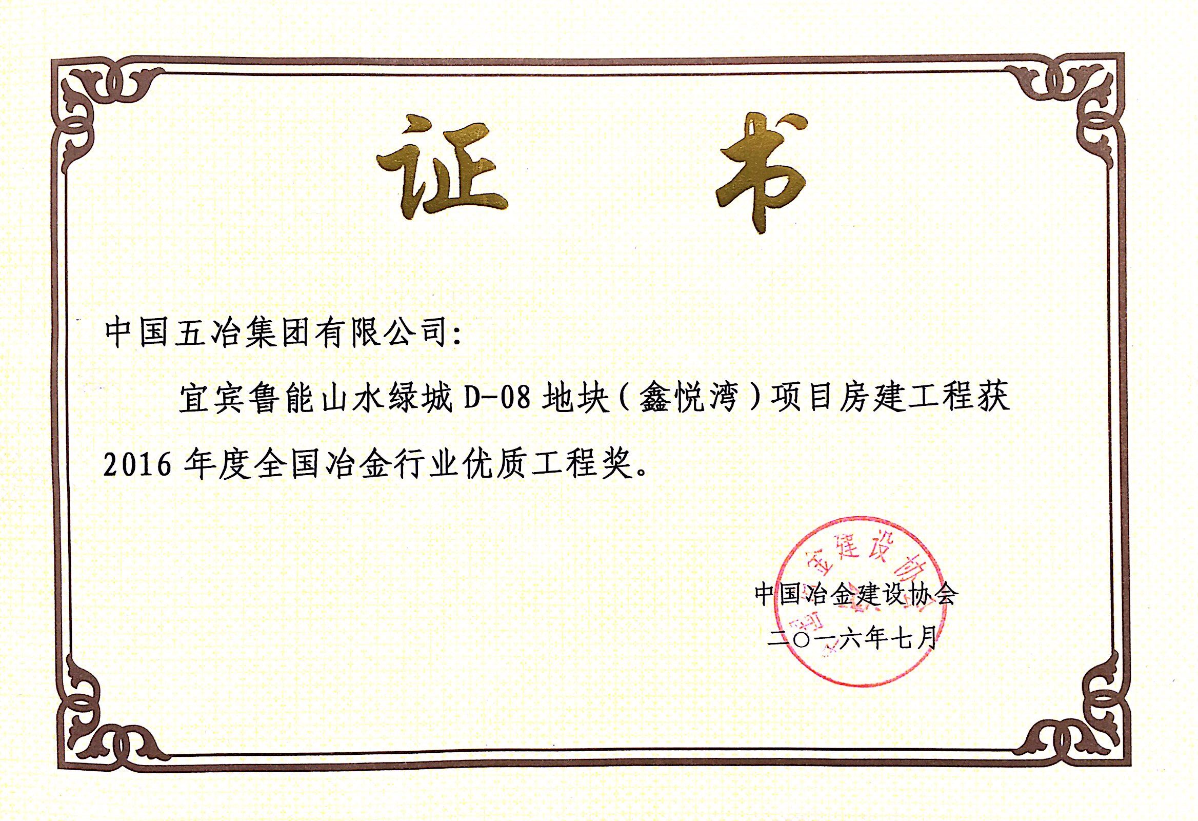 宜賓魯能山水綠城D-08地塊(鑫悅灣)項目—2016年度全國冶金行業(yè)優(yōu)質(zhì)工程獎