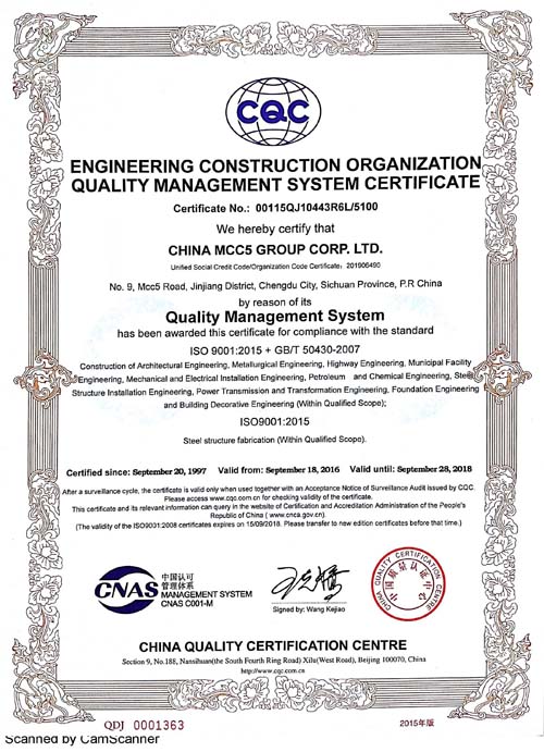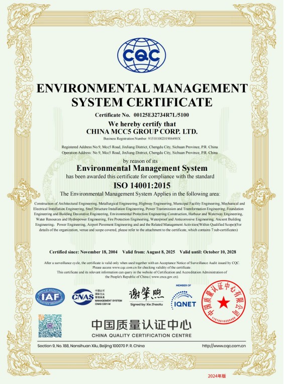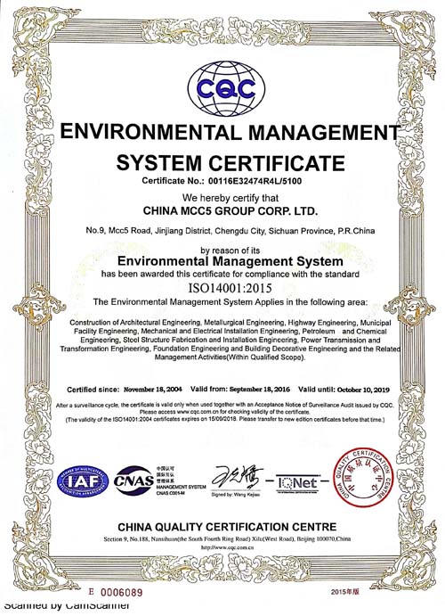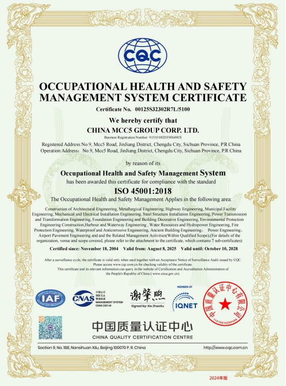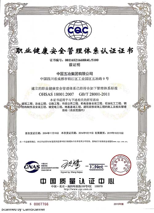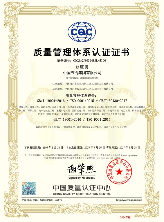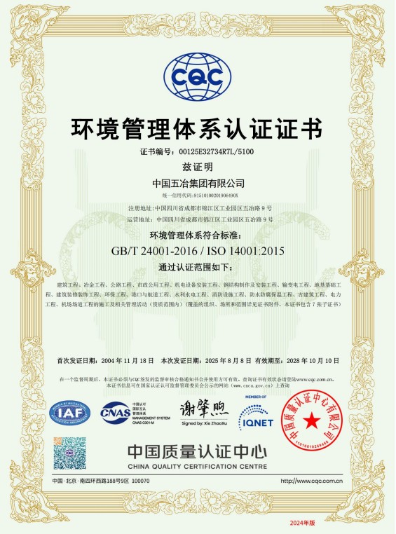 中國五冶集團有限公司(以下簡稱中國五冶集團),1997年通過ISO9000質(zhì)量體系認證。2004年,中國五冶集團按照ISO9001、ISO14001、OHSAS18001國際標準要求,建立質(zhì)量環(huán)境職業(yè)健康安全整合型管理體系并通過三標一體認證。2011年,中國五冶集團按照GB/T50430-2007《工程建設(shè)施工企業(yè)質(zhì)量管理規(guī)范》要求,建立并通過質(zhì)量環(huán)境職業(yè)健康質(zhì)量管理規(guī)范的三標一規(guī)范體系認證,至今保持三標一規(guī)范管理體系連續(xù)、平穩(wěn)和協(xié)調(diào)運行。
