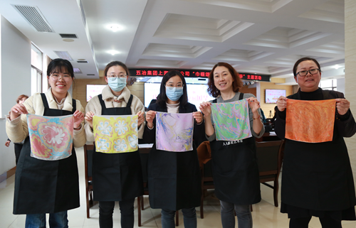 在水拓絲巾手工制作活動(dòng)中感受文化遺產(chǎn)之美,并為女職工們送上“玫瑰陣”和祝福語(yǔ)。