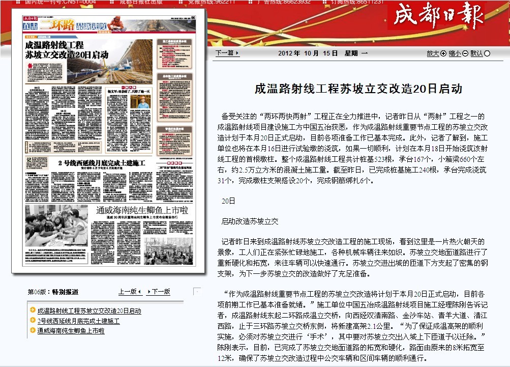 成都日報報道:成溫路射線工程蘇坡立交改造20日啟動