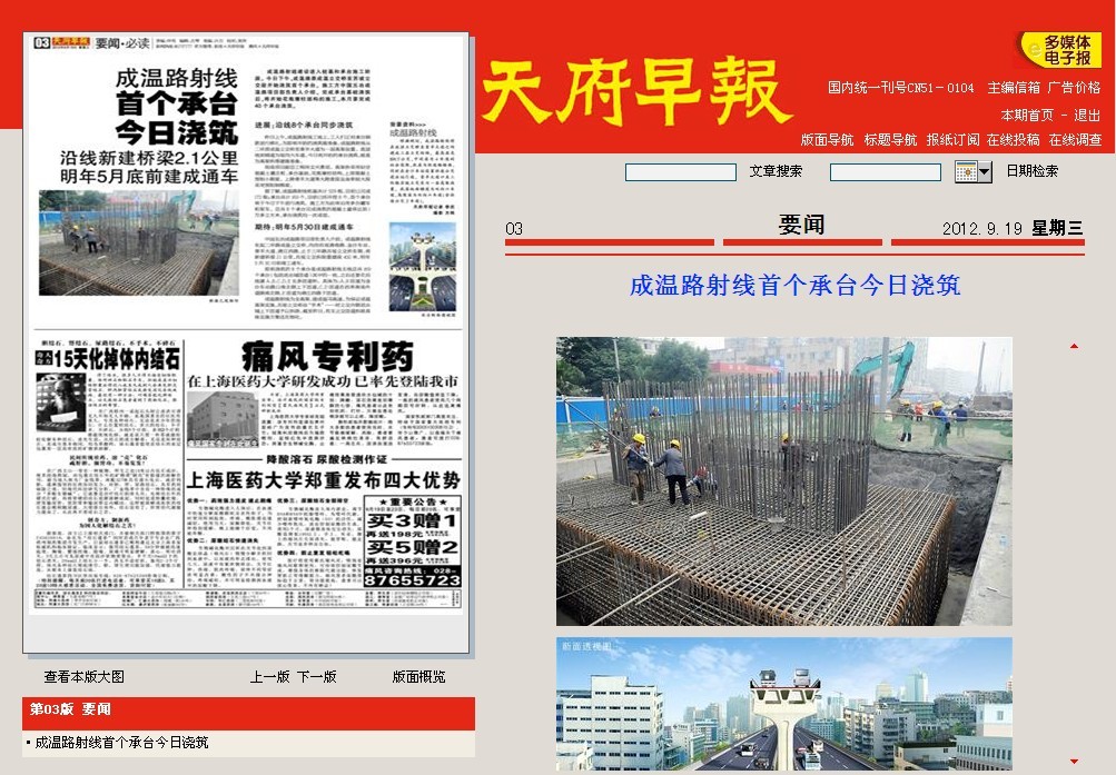 天府早報報道:成溫路射線首個承臺今日澆筑