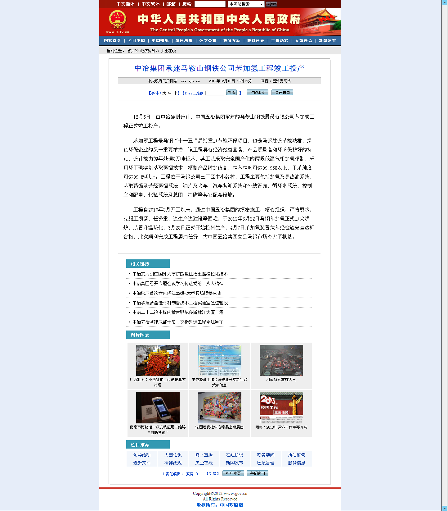 中央人民政府網(wǎng)報(bào)道:中冶集團(tuán)承建馬鞍山鋼鐵公司苯加氫工程竣工投產(chǎn)