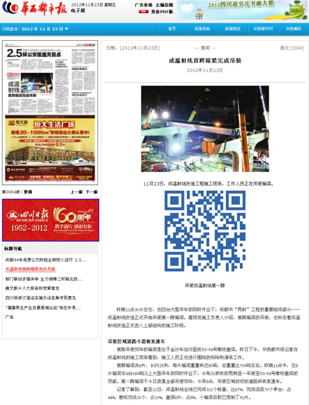 華西都市報報道:成溫射線首跨箱梁完成吊裝