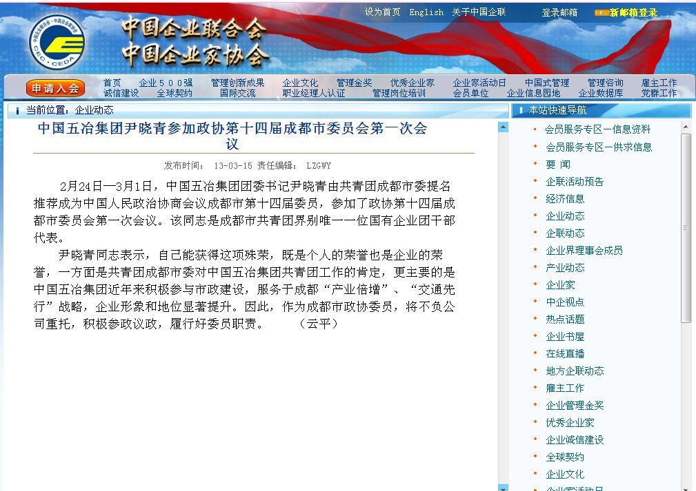 中國企業(yè)聯(lián)合會網(wǎng)報道:中國五冶集團(tuán)尹曉青參加政協(xié)第十四屆成都市委員會第一...