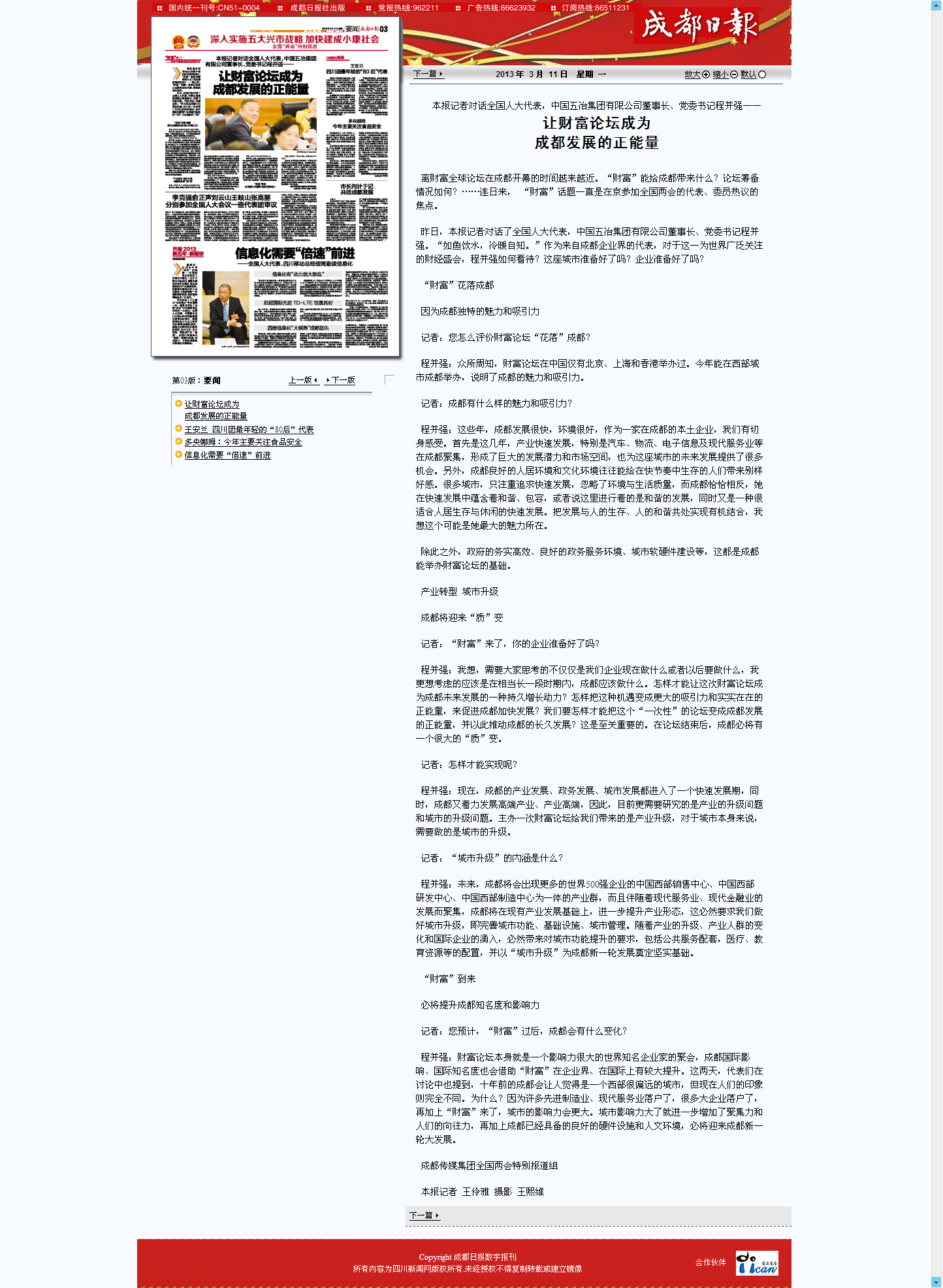 成都日報報道:讓財富論壇成為成都發(fā)展的正能量