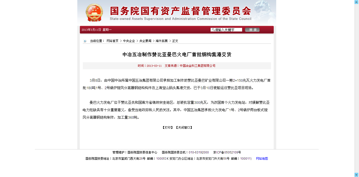 國資委報道:中冶五冶制作贊比亞曼巴火電廠首批鋼構集港交貨