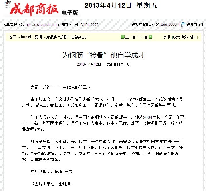 成都商報報道:為鋼筋“接骨”他自學成才