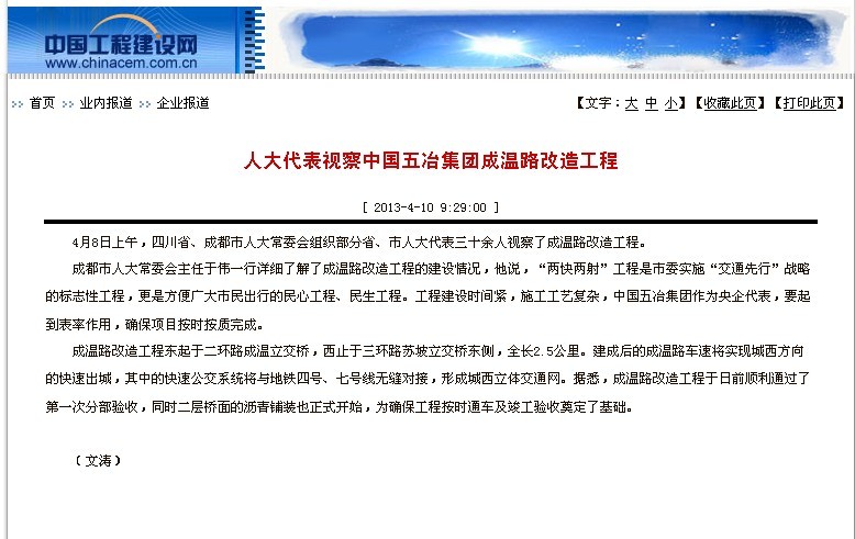 中國工程建設網報道:人大代表視察中國五冶集團成溫路改造工程
