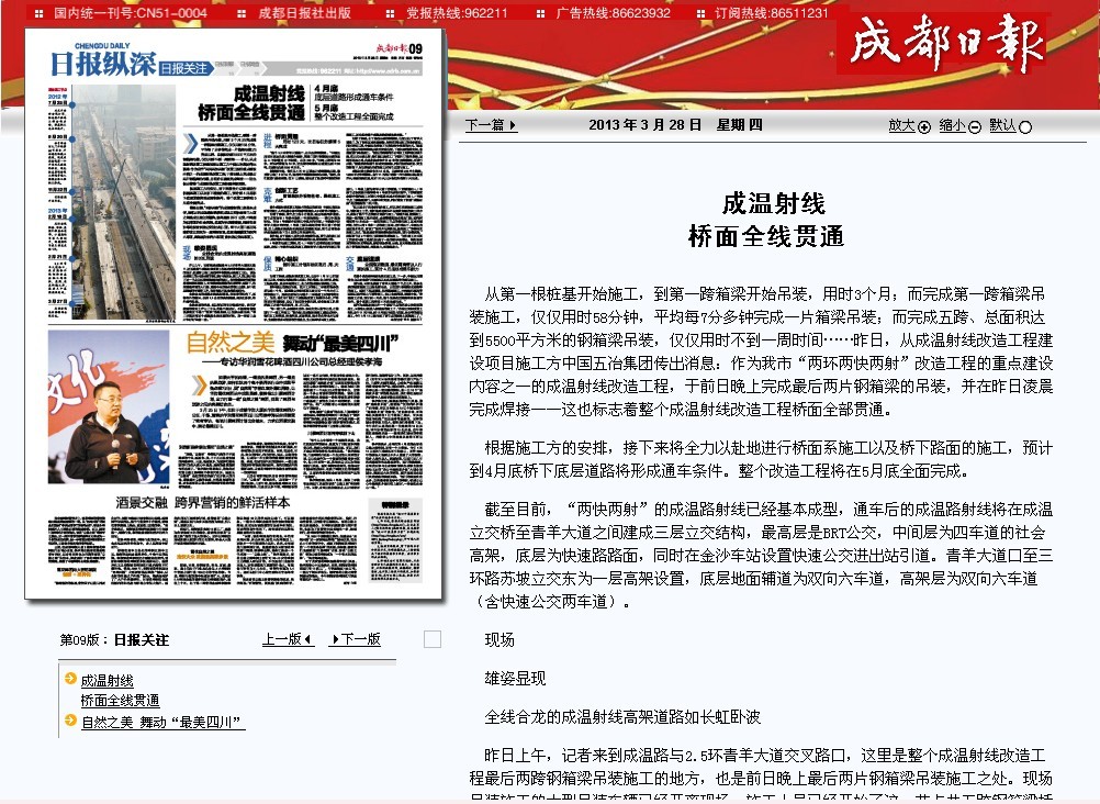 全線貫通的消息,也讓附近的市民倍感興奮。家住羅家碾的張女士昨日上午從此路口經過時,不經意間便發現原來這個路口“空缺”的高架橋,已全部吊裝完畢,“等二環路還有這個成溫路全線貫通的時候,我一定要上去開車好好體驗一盤。”