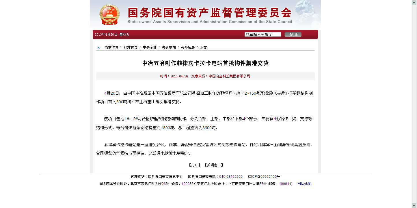 國資委報道:中冶五冶制作菲律賓卡拉卡電站首批構件集港交貨