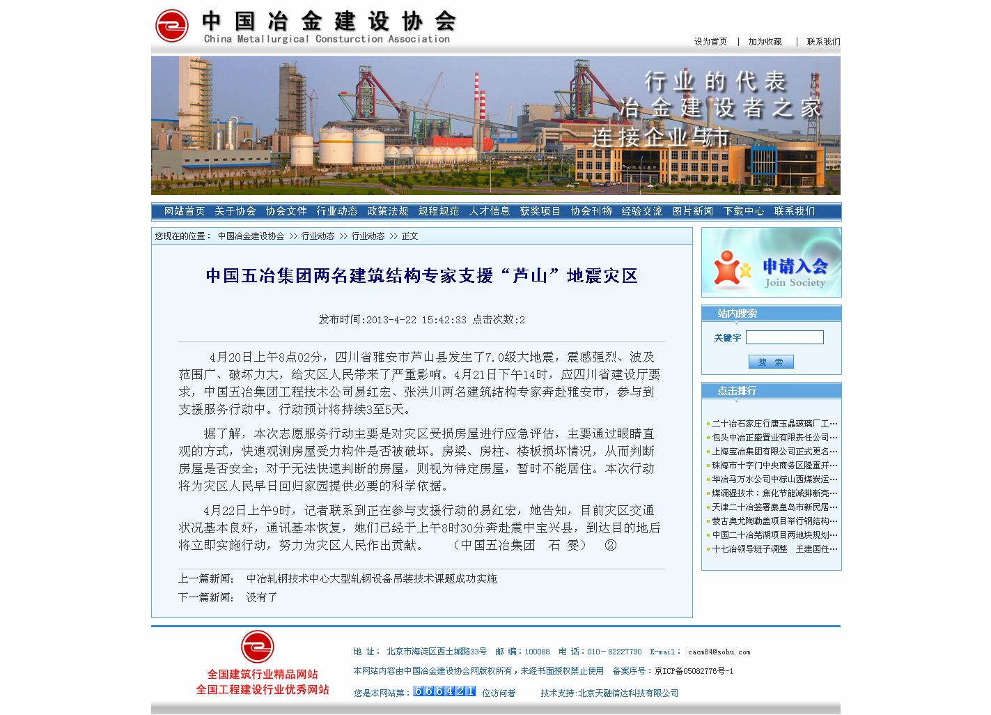 中國冶金建設(shè)網(wǎng)報道:中國五冶集團兩名建筑結(jié)構(gòu)專家支援“蘆山”地震災(zāi)區(qū)