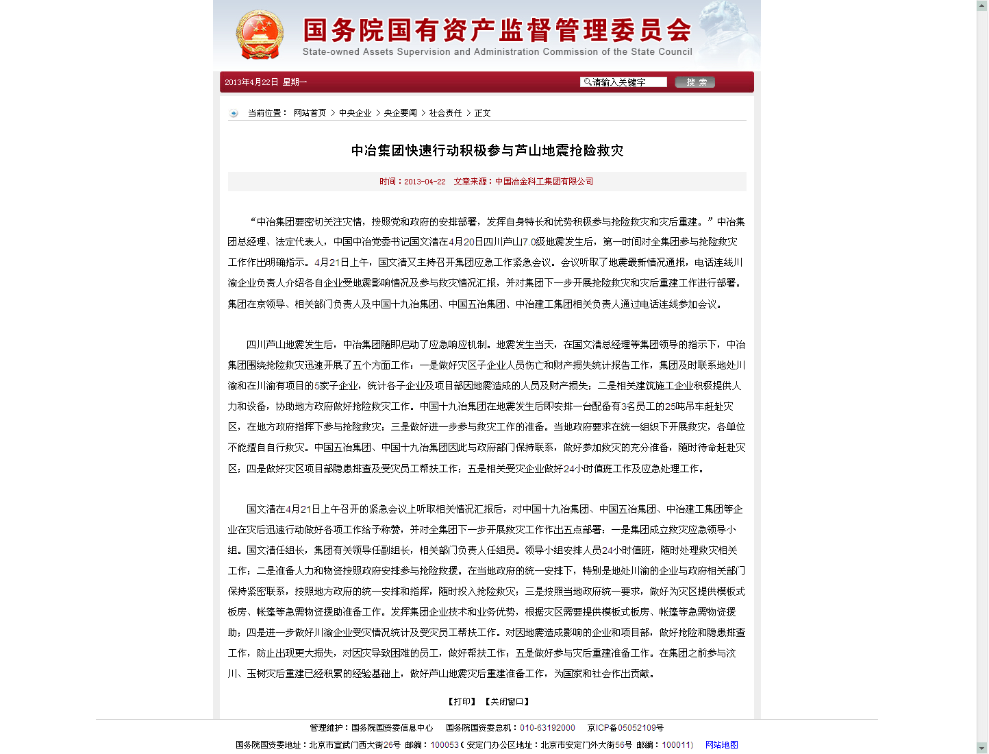 四川蘆山地震發生后,中冶集團隨即啟動了應急響應機制。地震發生當天,在國文清總經理等集團領導的指示下,中冶集團圍繞搶險救災迅速開展了五個方面工作:一是做好災區子企業人員傷亡和財產損失統計報告工作,集團及時聯系地處川渝和在川渝有項目的5家子企業,統計各子企業及項目部因地震造成的人員及財產損失;二是相關建筑施工企業積極提供人力和設備,協助地方政府做好搶險救災工作。中國十九冶集團在地震發生后即安排一臺配備有3名員工的25噸吊車趕赴災區,在地方政府指揮下參與搶險救災;三是做好進一步參與救災工作的準備。當地政府要求在統一組織下開展救災,各單位不能擅自自行救災。中國五冶集團、中國十九冶集團因此與政府部門保持聯系,做好參加救災的充分準備,隨時待命趕赴災區;四是做好災區項目部隱患排查及受災員工幫扶工作;五是相關受災企業做好24小時值班工作及應急處理工作。