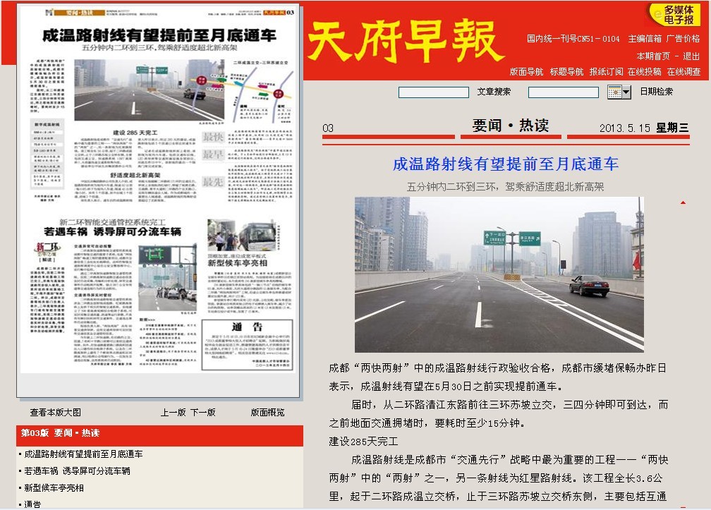 成溫路射線是“兩快兩射”中最早通過驗收的工程,于4月初開始進行分部驗收,5月13日順利通過行政驗收,達到全面通車條件。