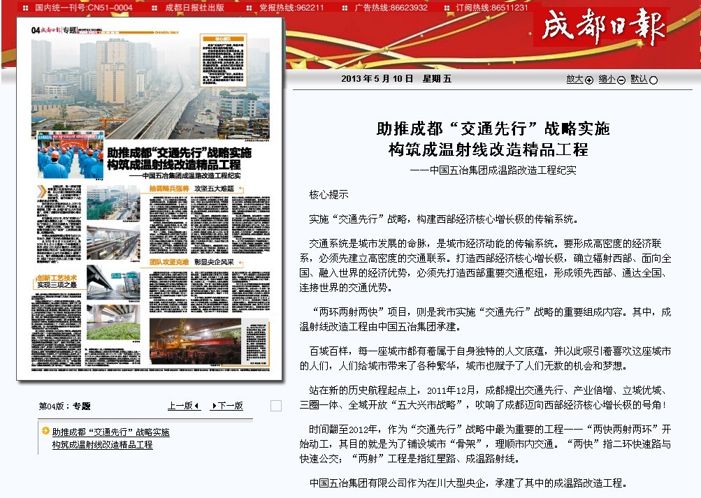 成溫路工程意義重大。2013年5月5日,包括《成都日報》、成都電視臺、《成都商報》、《成都晚報》等多家媒體聚焦于此,共同見證了成溫路改造工程達到實現全面通車條件的目標。看著一條嶄新筆直的大道宛如雨后彩虹一般架設在空中,中國五冶集團竭盡全力,用辛勤的汗水履行了屬于央企的社會責任,力促成都地方經濟社會的發展!