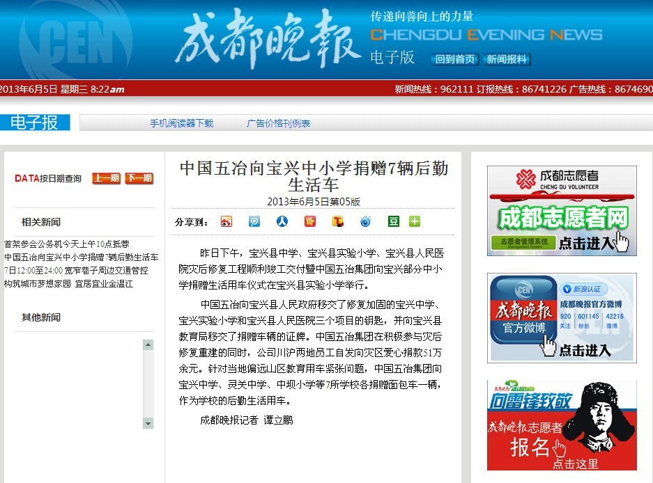 成都晚報報道:中國五冶向?qū)毰d中小學(xué)捐贈7輛后勤生活車