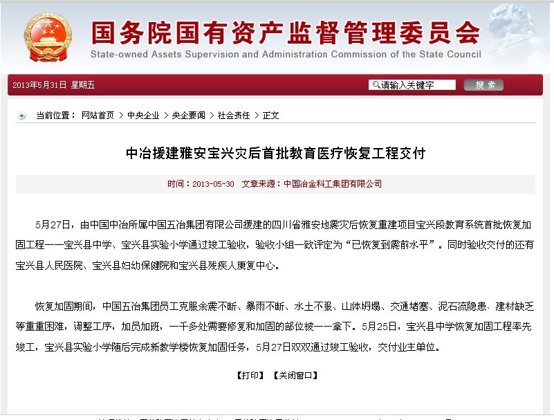 國資委報道:中冶援建雅安寶興災(zāi)后首批教育醫(yī)療恢復(fù)工程交付