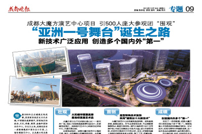 成都晚報對此進行了全過程的跟蹤報道,并在12月18日發行的成都晚報中進行了整版宣傳報道。報道指出:成都大魔方項目是一個擁有世界一流,國際領先水平的演藝兼容體育賽事的大型現代化場館項目;是一個擁有六大超級業態價值鏈有效疊加,相得益彰,素質一流的大型城市綜合體項目;是一個占盡成都高端資源配套和絕版核心地段的文化產業商業地產項目。歷史賦予了它承擔現代文明城市精神圖騰和文化地標的使命!在成都大魔方項目實施中,中國五冶創造了多個國內外“第一”,在成都的工程建設中,寫下了濃墨重彩的一筆,這也贏得成都建設部門及行業的一致稱道。(譚波瀾)