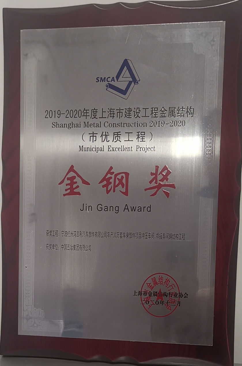 寧波杭州灣吉利汽車部件有限公司年產30萬套車身部件項目標準車間鋼結構工程獲2019-2020年度第二批上海市建設工程金屬結構“金鋼獎”(市優質工程)