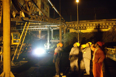 7月7日,沙鋼焦化一車間外的高壓電纜橋架因被吊車撞擊,立柱、橋架全部倒塌,電纜、水管、蒸汽管道等摔落在廠區(qū)道路上,其中部分電纜電壓高達(dá)10000V,嚴(yán)重威脅著人員、設(shè)備、車輛安全。同時(shí),該橋架上的電纜直接影響到焦?fàn)t、除塵風(fēng)機(jī)、水熄焦泵的用電。五冶集團(tuán)上海有限檢修公司在不影響生產(chǎn)的情況下對(duì)電纜橋架帶電修復(fù)。