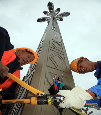 5月30日,中國五冶集團路橋公司內江漢安大道改建工程完成路面鋪油節點。圖為施工人員正在安裝路燈。???????? ?(鄧超攝)